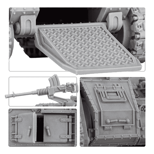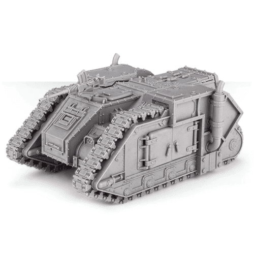 Aurox Armoured Transport – With the influx of material resources and template constructs recovered from newly compliant worlds throughout the expanding frontiers of the great crusade, early attempts were made to standardise the equipment and war machines of the Imperial Army. The Aurox Armoured Transport is one of the earliest examples of this vision of a single standard for equipping the Imperial Army. A further variant of the Aurox is used by the Solar Auxilia, re-fitted for extreme environmental conditions. A utilitarian transport vehicle, the Aurox is little more than a cube of extremely dense armour with an enormous tank track either side – each surface of the hull has at least 1 set of doors, used for the rapid disgorgement of the up to 10 models carried within. At the front is a driver’s hatch with a sensor array beside it, and a mounted heavy stubber at the top, with hatch behind. A large exhaust pokes out from either side, and yet another hatch (there are actually 6 in total, making this a rather hatchsome transport) makes up the bulk of the rear. The Aurox Armoured Transport comes as 21 components.