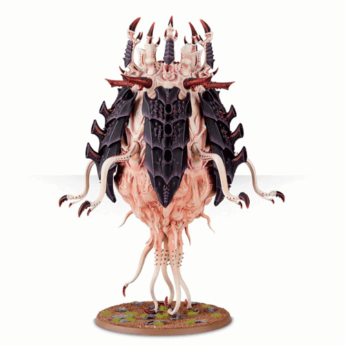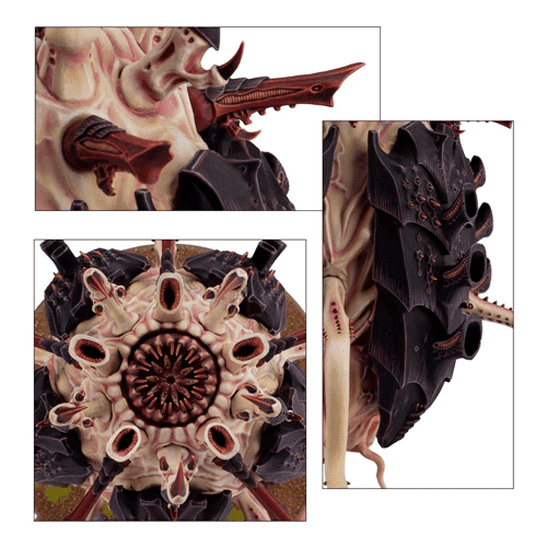 Tyrannocyte – Spat from the quivering orifices of hive ships in low orbit, the Tyrannocyte thunders through tortured skies to slam into the surface of its target world. The impact causes its gravid belly to split, disgorging the host of Tyranids that dwell inside. This 124-piece resin kit makes one Tyrannocyte. The armoured carapace can be modelled closed to the body or open to act as an airbrake as the Tyrannocyte makes planetfall. It is armed with five deathspitters which can be replaced by barbed stranglers or venom cannons. This kit can alternatively be built as a Sporocyst and Mucolid Spore. The full rules for using the Tyrannocyte and the Sporocyst and Mucolid Spore in games of WR-40 are included in White Dwarf Issue 41.